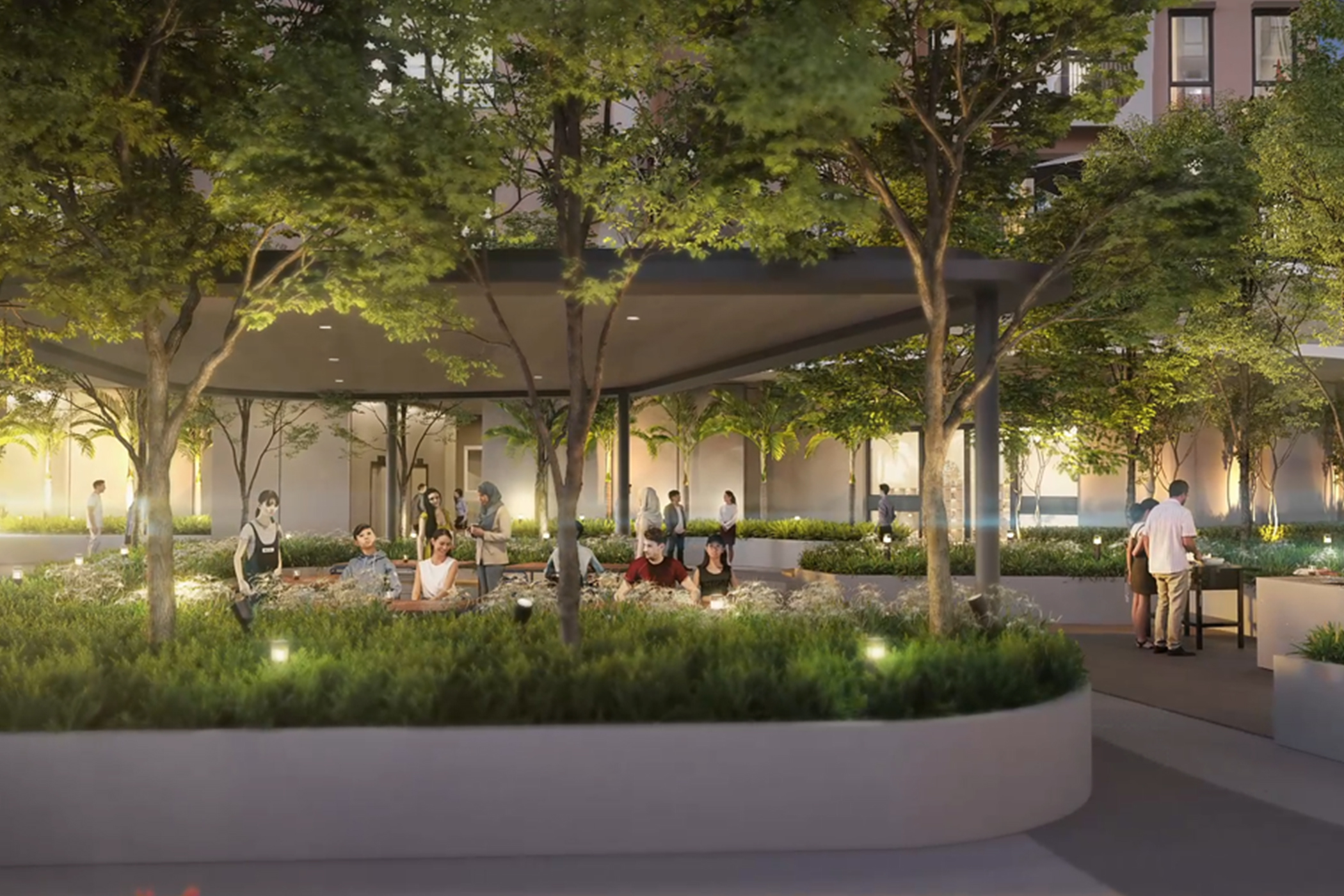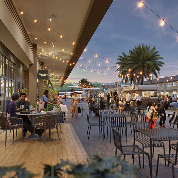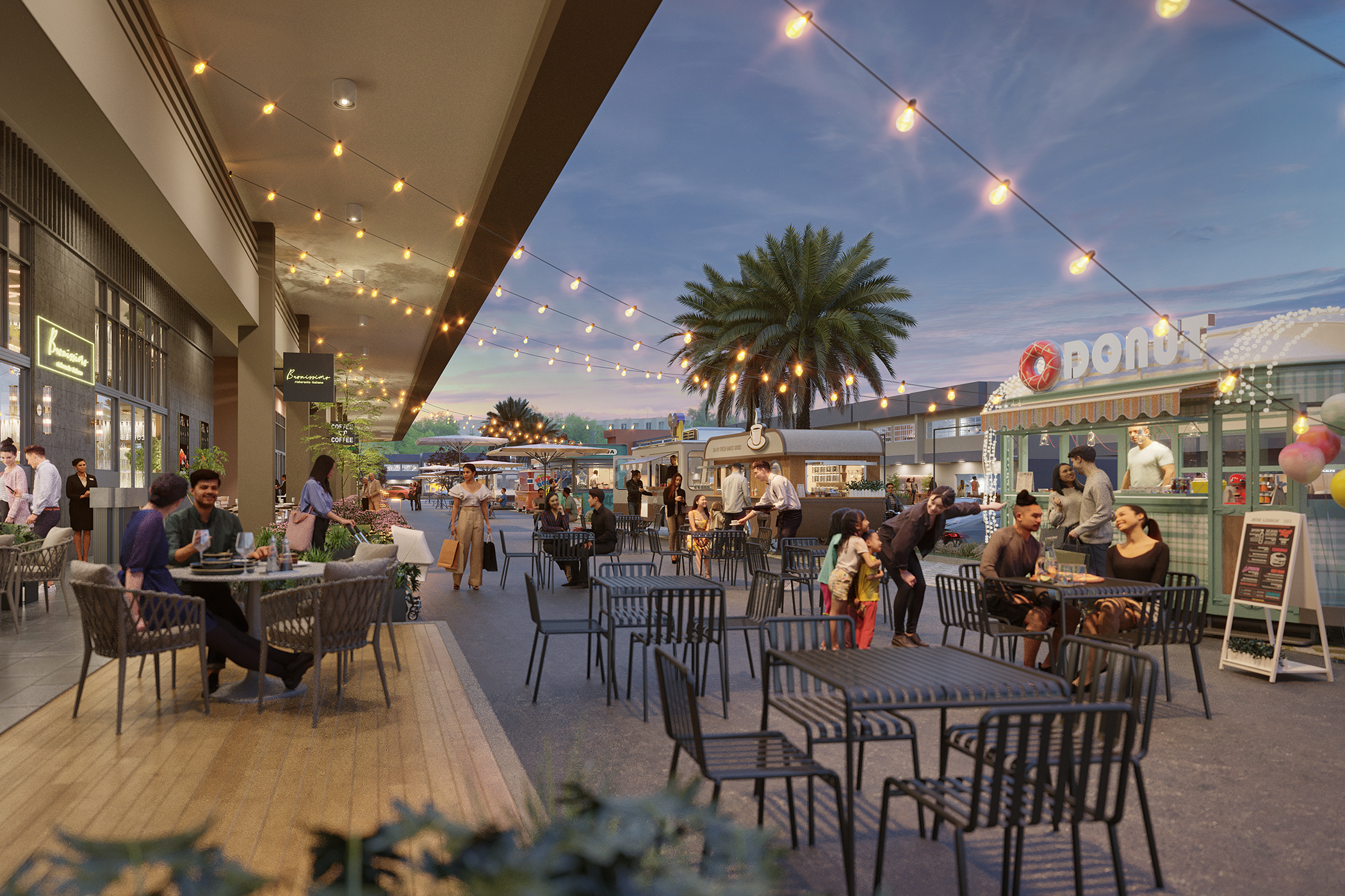A purpose designed Auto-free F&B destination with a combination of themed restaurants and street food trucks, food trailers, and kiosks featuring a mixed F&B experience with multi-national food selections
